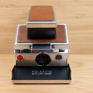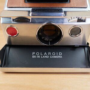 Vintage Polaroid SX-70 Land Camera, complete with a classic leather case. Iconic instant camera known for its folding SLR design and high-quality instant photos.