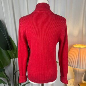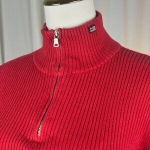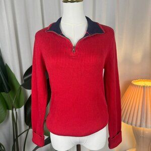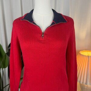 Vintage Polo Jeans Co. Ralph Lauren classic 90s ribbed half-zip sweater in red with navy contrast collar. 100% cotton, with an embroidered RL flag at collar & RL zipper. Perfect for that American heritage, classically preppy fall style.