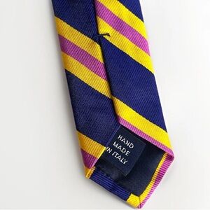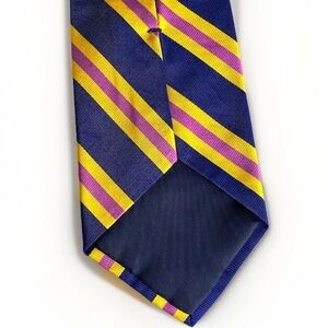 Crafted from luxurious silk, this striped tie boasts a vibrant mix of navy, yellow, and pink hues, adding a splash of colour to your ensemble. Its handmade quality ensures a unique product, confirming its status as a vintage treasure. The tie is also a tasteful nod to the theme of money, with its sophisticated character and quality construction.