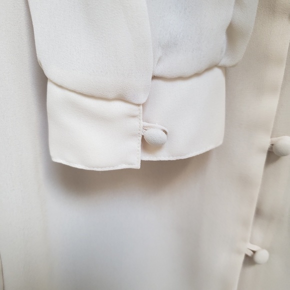 This rare beauty in excellent condition considering its timeless age. One flaw but is un noticeable would be the missing front bottom button, see last slide. Special details, pintucked shoulders, covered buttons. Size 14 but is a petite fit, ideal for a size 10/8 in order to get that loose fit.