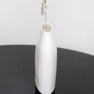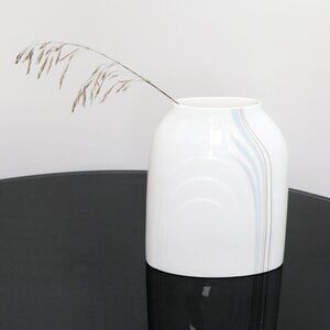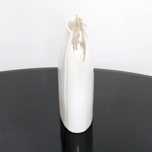 A lovely white ceramic vase with a unique asymmetric arch silhouette and flat oval profile. Subtle 3 dimensional arches enhanced with painted sky blue leafy pointed lines accentuates these curves along with metallic gold trim. Marked Royal Doulton, Impressions collection by Gerald Gulotta.