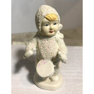 This vintage porcelain set features three charming snow baby figurines, each uniquely posed. They exhibit delicate craftsmanship, with a textured finish and subtle glitter for added appeal. These collectible pieces evoke a nostalgic winter charm and are ideal for display in a home or office setting.