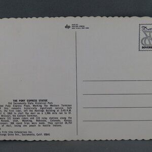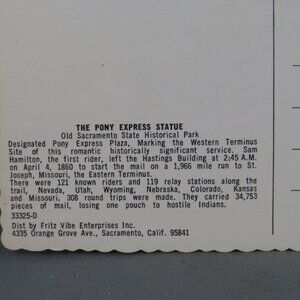 Up for sale is a vintage postcard. It features an image of the Pony Express statue located in the old Sacramento Historical Park. What a great addition to any colleciton.