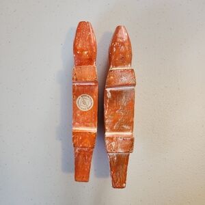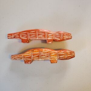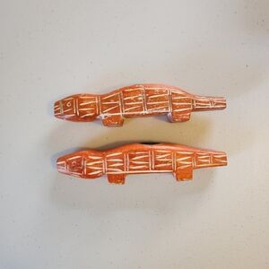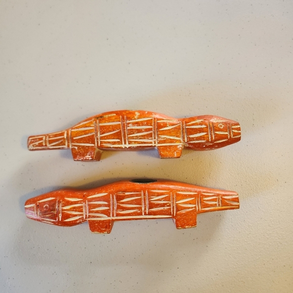 Pair of Vintage Pottery Barn Boho Whitewashed Orange Figural Lizard Wood Candle Holders