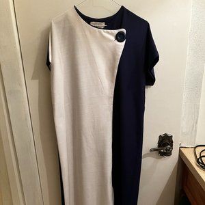Vintage Pour Vous dress, colour blue and white, lightly used, polyester blend, i know i says 6 but i pulled it on over a shirt so i think it could be worn by an 8, i remember my mother wearing it and she was not a 6