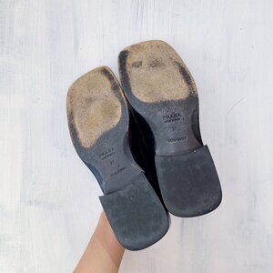The perfect loafer, beautiful leather Prada loafers from the 90s, with square toe, low block heel, strap/saddle with slot and little Prada logo, and lipped apron with stitching. 90s Prada is so sought after & for good reason!
