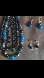 This is a vintage Premier Designs triple-strand beaded necklace and (TWO pairs of ) earrings set featuring black faceted beads, silver-tone accents, and blue spherical beads.