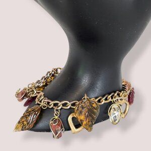 This vintage bracelet is made of a gold tone metal and has a c clasp closure. The bracelet has a chain base with many different pieces dangling down. There are gold tone hearts with the centers cut out, red and yellow pressed glass leaves, and tumbled semi-precious stones wrapped in wire. I had to do a bit of research on this piece, especially since it has so many different stones. From what I've learned, it was most likely made between the late 1950s and early 1970s. Based on my research, the stones are as follows: