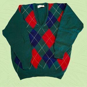 Beautiful vintage Pringle of Scotland argyle sweater. 100% wool, forest green with blue and red argyle on the front, Pringle emblem embroidered on the arm. No size but fits xl. excellent condition.