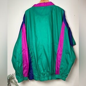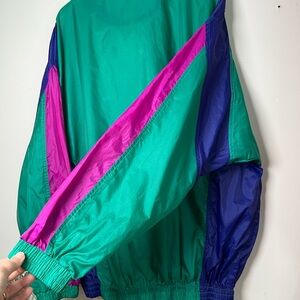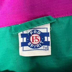 Prospirit vintage windbreaker jacket. Pullover style with snap buttons down half. Colourblock, green, a purple/pink and blue. Works as unisex for sure! Typical 90’s style. Nylon material - not thick.