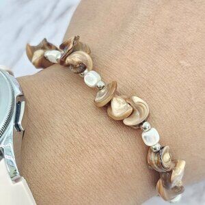 Vintage Puka Shell Bracelet crafted in the Philippines, featuring bronze hues and measuring 7.3 inches in length. Handmade with intricately placed shells, this unique piece adds a touch of nostalgia and charm to any outfit. Perfect for Christmas, graduation, or birthday gifts, this vintage bracelet is a timeless accessory that exudes a one-of-a-kind style.