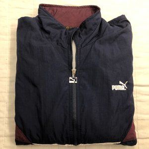 Rare Large Vintage Puma Full Zip Windbreaker Jacket, lined interior, burgundy/navy/white. Full nylon shell, lining is cotton/polyester. Size: L US