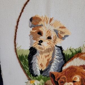 Vintage "Puppy Love" crewel embroidery piece, originally a kit by Sunset Stitchery.