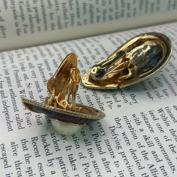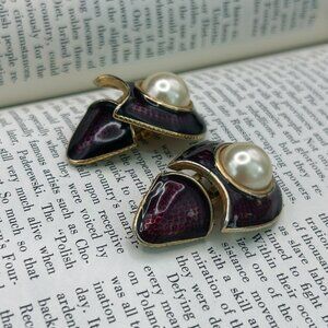Vintage Purple Enamel Dangle Clip-On Earrings, Faux Pearl, Unsigned