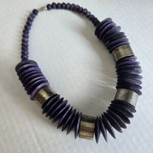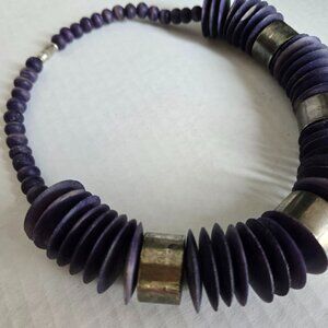 Vintage Purple Wood Disk & Silver Chunky Choker Necklace