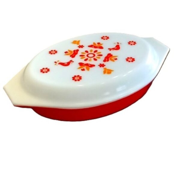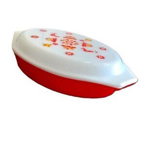 Vintage Pyrex Friendship Pattern 1.5 Quart Divided Casserole Dish with White Lid