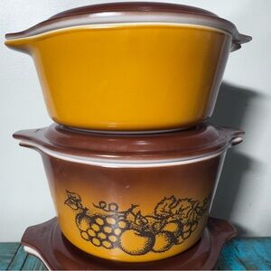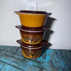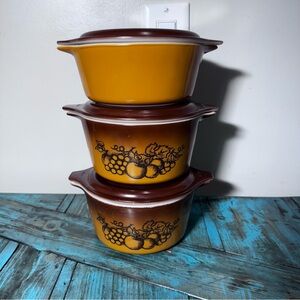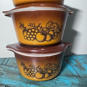Vintage Pyrex Old Orchard Casserole Dishes Brown Lids