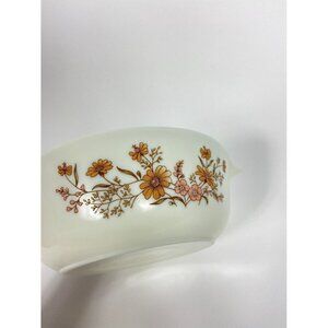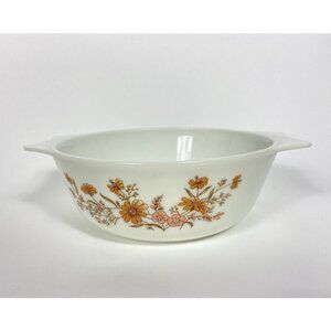 Vintage Pyrex casserole dish pink tan floral pattern.