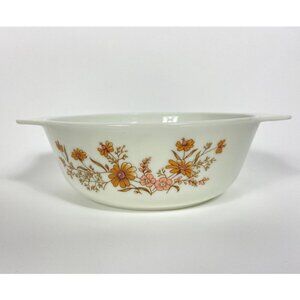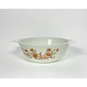 Vintage Pyrex round casserole dish. Pink tan floral pattern.