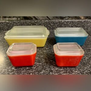 Pyrex vintage primary colors 8 piece refrigerator dish set 501 502 503. In great shape. The lids have no cracks. Just minimal flea bites. Colors are vibrant and shiny.