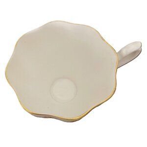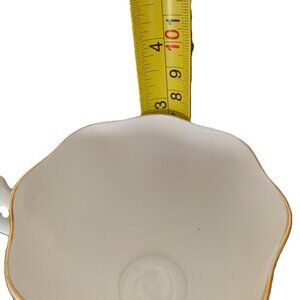 Approximate measurements of the cup: 3 & 1/8 inches in diameter, 4 & 1/8 inches wide with the handle; . Saucer measures approximately 5 & 9/16 inches in diameter