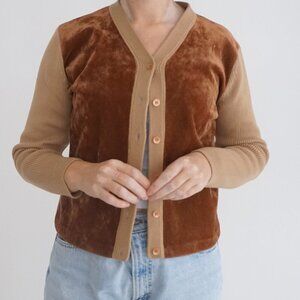 Designed with a classic crewneck and ribbed cuffs and hem, this cardigan provides both comfort and structure. The luxurious velvet-like texture adds a unique twist to the timeless cardigan silhouette, making it a standout piece in any wardrobe. Whether paired with jeans for a casual day out or styled with a skirt for a more refined look, this vintage cardigan is an easy go-to for any occasion.