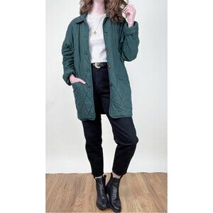 This charming vintage 90s quilted jacket in a rich forest green hue offers timeless style, featuring classic diamond quilting, side pockets, short collar, & button front closure. Its versatile design makes it a perfect layering piece for transitional weather, adding a pop of color to any ensemble. Ideal for those seeking classic aesthetics without sacrificing any comfort