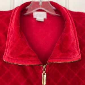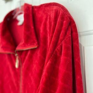 This striking red velour vintage gem is by Lingerie Nordstrom. It features quilted construction with stitched in shoulder pads (easily removable), gold contrast zip closure & an oversized fit.