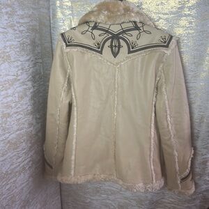 Tan and cream tones with brown Embroidery details.two pockets and three large buttons closure