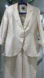 In an off white colour silk consisting of high waisted, wide leg pants and a matching one button jacket.