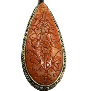 Eye-catching vintage Monet necklace with a large, intricately carved faux cinnabar teardrop pendant set in a detailed bezel with faux jade stones. Features strands of luminous faux pearls and translucent green glass beads, all in an Asian Revival design. Signed Monet tag on the chain. Circa late 1970s. Measures approx. 20" long with a 2.25" pendant. Excellent vintage condition . This is a rare statement piece that is hard to find and beautifully made—a true standout in Monet’s vintage lines.