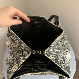 Bag features a black and white design with a scene depicting people and animals, with black straps and silver-toned hardware.