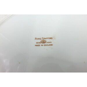 A delightful example of fine English craftsmanship, this Royal Stafford bone china plate features an intricate pink rose floral pattern and gold accents.