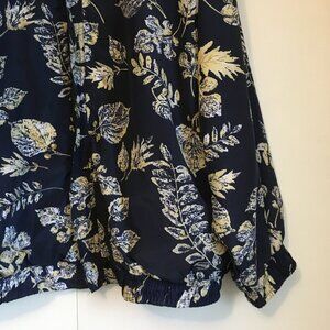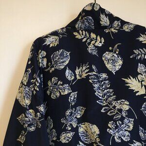 Very good preowned vintage condition, 80s or 90s, seasonal bomber jacket in satiny, semi sheen dark navy blue featuring a seasonal pattern of leaves and botany in pale yellow, white and grey by R&R Sport. A wise and I dare say seasoned colour palette.