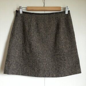 Very good preowned vintage condition brown short preppy, wool skirt from the Y2K era by RW&CO. Speckled with white, tan and grey. Made in Canada, this cute is fully lined and has a brown leather trim (may be faux leather, but tag is a little worn). Perfect accompaniment for turtleneck and tights. Beautifully sewn.