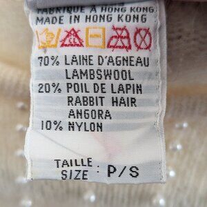 Unique dainty little sweater with beautiful pearl neckline detail - and the softest knit ever! True to size, maybe best for Size XS. Modest crew neck. Wrist length sleeves. Ivory coloured. Made in Hong Kong. 70% lambswool 20% rabbit hair angora 10% nylon.