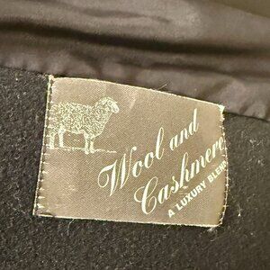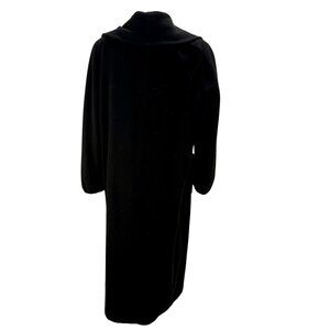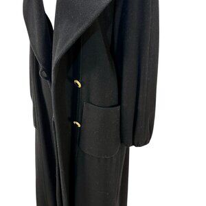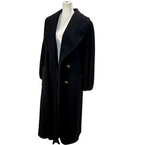 Elegant vintage black coat by Raffinati crafted from a luxurious wool and cashmere blend. This timeless piece features an oversized shawl collar two statement gold tone buttons and spacious front patch pockets.The longline silhouette and softly gathered sleeves create a refined yet comfortable fit A classic outerwear staple that combines warmth sophistication and versatility.