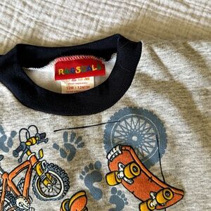 Excellent vintage condition. Super soft and cozy, with a playful bike, skateboard, and rollerblade graphic. Unique plaid sleeves and ribbed cuffs.