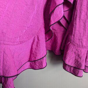 Double breast closure (one row) - beautiful ruffle neckline - the metal edging allows you to shape it however you want! Trumpet silhouette with split wrist cuff. Label indicates water resistant! Bottom ruffle tier hem as well. Light shoulder pads (can be snipped out). Has pockets! Lightweight.