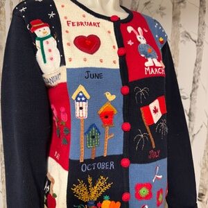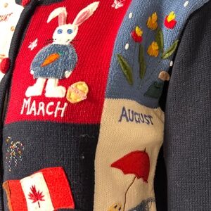 This cardigan features 12 calendar months with each month depicted with its own cheerful theme!