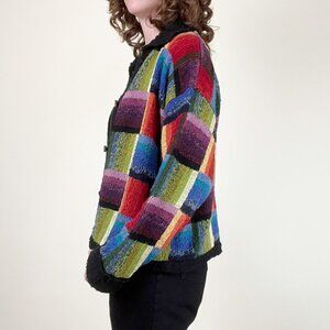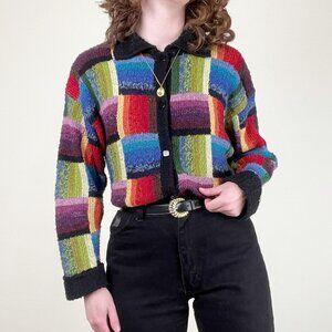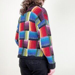 Embrace a playful, artsy vibe with this vintage cotton & wool blend cardigan sweater, featuring a stunning patchwork of vibrant, multi-colored geometric blocks. This cozy, button-up sweater is the perfect statement piece to add a fun pop of color to any outfit.