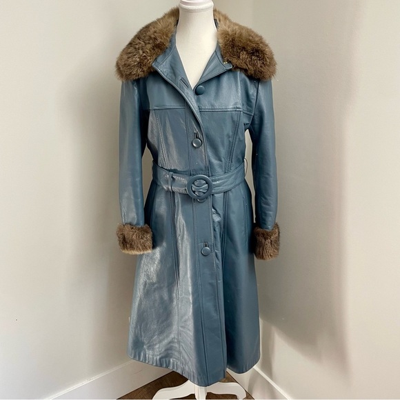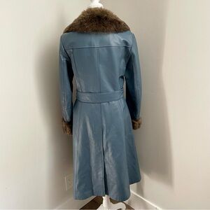 Vintage Rajac Leathers Penny Lane Fur Trim Leather Coat Longline Grey Size Small. Gorgeous genuine leather coat with fur trim along the neckline and sleeves. Vintage from the early 70's. Full button down. Quilted lining makes it so comfortable to wear. No size tag but fits like a small (mannequin in size small for reference). Check measurements below to ensure fit. Excellent condition other than a small mark on the back of the jacket shown in last photo.