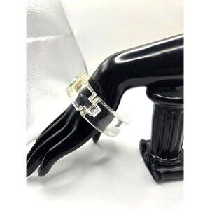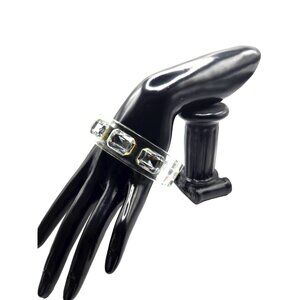 Step out in style with this striking vintage Lucite cuff bracelet! Crafted from chunky clear Lucite, this bold piece is set with three oversized, rectangular faceted rhinestones that catch the light beautifully. The hinged, open cuff design features a magnetic clasp for easy on/off and a secure fit.