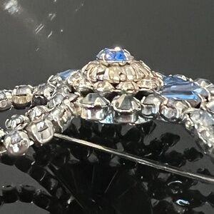 Vintage Signed Sherman Early 50's ultra high quality Blue and Clear Swarovski tapered baguettes rhinestones that capture the light and turn it into sparkling colors multilevel Brooch and matching Earrings that were converted from clip to pierced ( not signed) . Small damage to the plating of the brooch can be seen on the pictures. Please refer to the pictures as they are part of the description. For accurate sizing, we highly recommend referring to the measurements provided. It is important to note that the images displayed are magnified to showcase the intricate details of the item. Due to variations in monitors, the actual colors might slightly differ from what is seen on the screen.