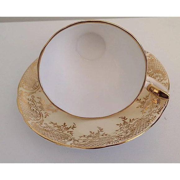 A delightful and elegant beige vintage Royal Standard teacup and saucer embellished with a gold filigree overlay.