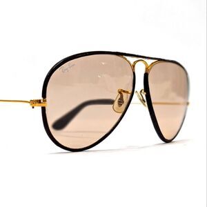 Photo Chromatic / ambermatic Bausch & Lomb changeable lenses which shade from a tinted brown to dark in direct sunlight. Nose bridge, arm & hinges are 10K gold plate. Dark brown leather with black highlights wraps both lenses and the ear pads. All of which is intact with one noted flaw, that does not affect function or integrity of the design (pictured). The right lens is etched Ray-Ban, both lenses are laser etched BL near the hinges and the nose pad hardware is also marked BL.