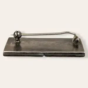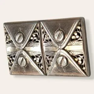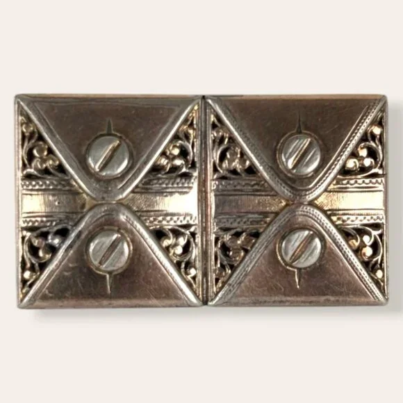 This vintage brooch is made of a silver tone metal and has a modern locking c pin closure. The brooch is shaped like a wide rectangle and the back is smooth and flat. The front is split into two identical halves, each with the appearance of a closed envelope. There are small intricate details with even small cut-outs. This brooch was intended to be filled or imbued with perfume, allowing it to waft out slowly as the brooch is worn. I'm not sure how the brooch is supposed to be filled, just that it is. There is wear throughout, but no issues affecting wearability. It does not currently smell like any perfume at all.