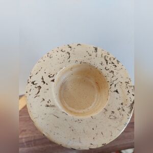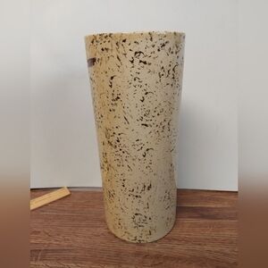 Vintage* Red Apples Ceramic Cylinder Vase. Cream-coloured with brown speckled base. Glazed. Pre-owned. Turn it upside down and can use as pillar candle holder. Signed "LCC". Approx 9.5" tall.