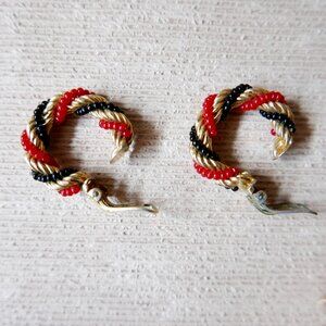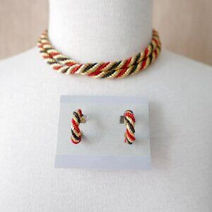 Make a statement with this striking vintage jewelry set featuring a bold red, black, and gold-tone twisted rope design. This eye-catching ensemble includes a long, braided-style necklace and matching hoop clip-on earrings. The classic color palette and twisted metalwork create a sophisticated, retro look perfect for dressing up any outfit.