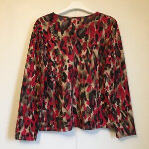 Very good preowned vintage condition, long-sleeved, lightweight, knit sweater pullover featuring a camo animal print like pattern in red, tan, brown and black by TanJay Petite. Super duper cute and a powerful statement piece.